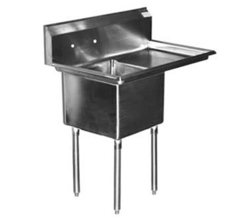 Serv-Ware – Sinks – 14″ Deep Heavy Duty Sink 1 Bowl – Dimensions: 38.5″ W x 23.5″ D x 45.5″ H – Materials: 16 Gauge, 304 Series Stainless Steel, 18″ wide x 18″ front-to-back x 14″ deep compartment, 18″ drainboard on right, 10-1/2″H backsplash, 8″ OC splash mount faucet holes, heavy duty, 3-1/2″ basket strainer included, stainless steel gussets, galvanized legs with adjustable bullet feet, NSF