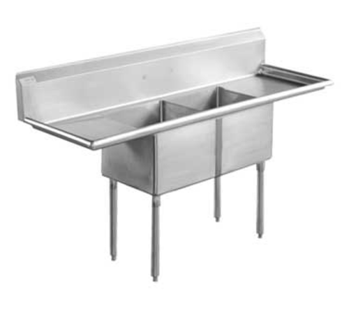 Serv-Ware – Sinks – 12″ Deep Economy Sink 2 Bowl – 68″ W x 25.5″ D x 45.5″ H, 18/304 stainless steel, 16″ wide x 20″ front-to-back x 12″ deep compartments, 18″ drainboards on left & right, 11-3/4″H backsplash, 8″ OC splash mount faucet holes, raised rolled edges on front & sides, 3-1/2″ basket drains with 1-1/2″ outlets, galvanized legs with adjustable plastic bullet feet, NSF