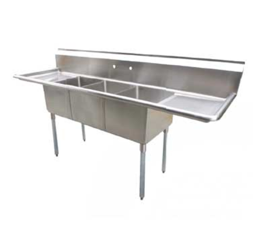 Serv-Ware – Sinks – 12″ Deep Economy Sink 3 Bowl – 90″ W x 23.5″ D x 45.5″ H, 18/304 stainless steel, (3) 18″ wide x 18″ front-to-back x 12″ deep compartments, 18″ drainboards on left & right, 11-3/4″H backsplash, 8″ OC splash mount faucet holes, raised rolled edges on front & sides, 3-1/2″ basket drains with 1-1/2″ outlets, stainless steel gussets, galvanized legs with adjustable plastic bullet feet, NSF