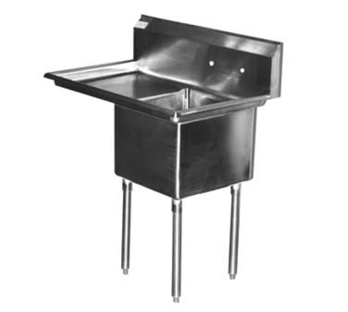 Serv-Ware – Sinks – 14″ Deep Economy 1 Bowl – 44.5″W x 23.5″D x 45.5″H, 18/304 stainless steel, 18″ wide x 18″ front-to-back x 14″ deep compartment, 24″ drainboard on left, 11-3/4″H backsplash, 8″ OC splash mount faucet holes, raised rolled edges on front & sides, 3-1/2″ basket drains with 1-1/2″ outlets, stainless steel gussets, galvanized steel legs with adjustable bullet feet, NSF