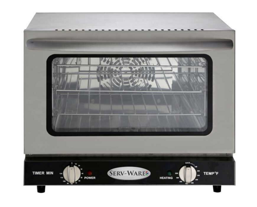 Serv-Ware – Electric Cooking – Counter Top Electric Convection Oven – Dimensions: 18.625″ W x 19.25″ D x 14.875″ H – Temperature Range: 150°F – 500°F – Amps: 12 – Voltage: 115 – Hz: 60 – Phase: 1 – Watts: 1440 – Materials: Stainless steel interior & exterior with dual pane glass and chrome wire racks – Warranty: 1 Year, Replacement Parts Only