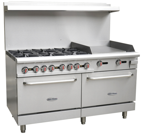 Serv-Ware – Gas Cooking – 60″ Gas Range with Six (6) Open Burners & 24″ Griddle – Natural Gas – Dimensions: 60″ W x 32.6″ D x 60″ H – Temperature Range: 250°F – 550°F – BTU/H: 30,000 per Burner – # of Burners: 6 – Gas Line: 3/4 – W.C. for Natural Gas: 4 in. – W.C. for LP: 10 in. – Materials: Stainless steel front, back riser, high shelf, oven handle and bullnose. High temperature burner knobs with set screw. Nickel plated bullet feet. Porcelain door liner and oven bottom. – Warranty: 1 Year